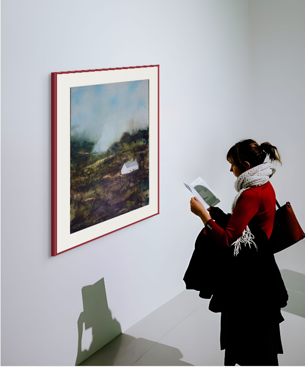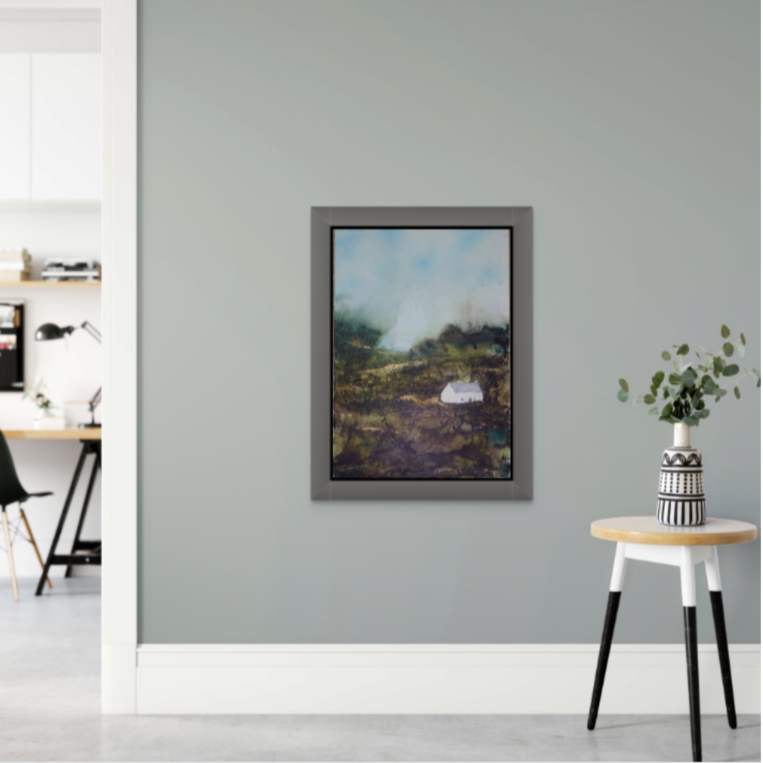 A lone white cottage, modest yet radiant, anchors us within a dreamlike expanse of verdant hills and ethereal mist. The abstracted landscape evokes the wild beauty of untamed nature, layered with richly textured brushwork and organic mixed media that invite tactile engagement.