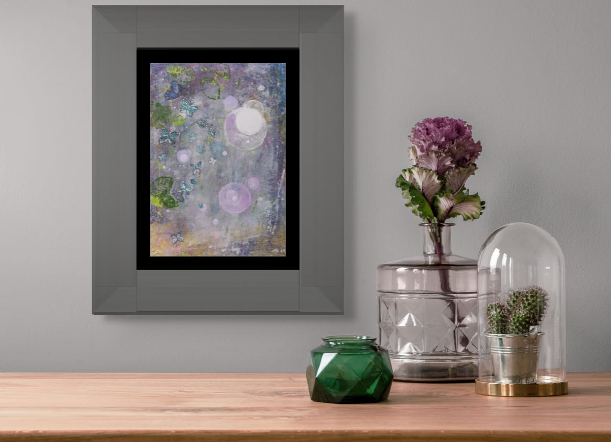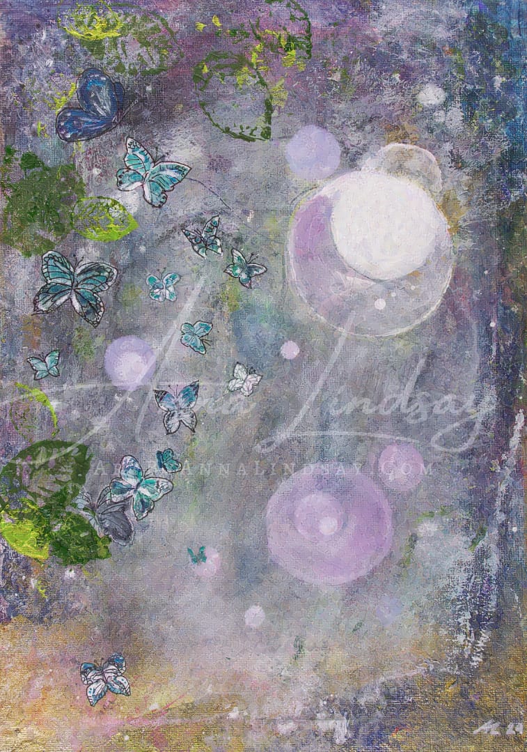 The butterflies here almost move in soundless harmony, as part of the energy, suspended between the foliage and those orbs of light. The lilacs and dusky blues bring calm, but then those leafy greens and hints of gold lift it, as though the light is playing hide and seek.