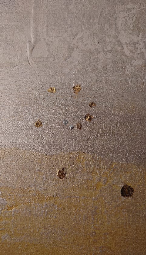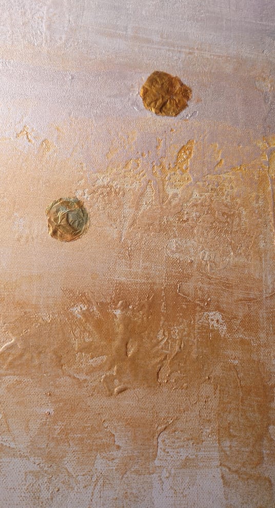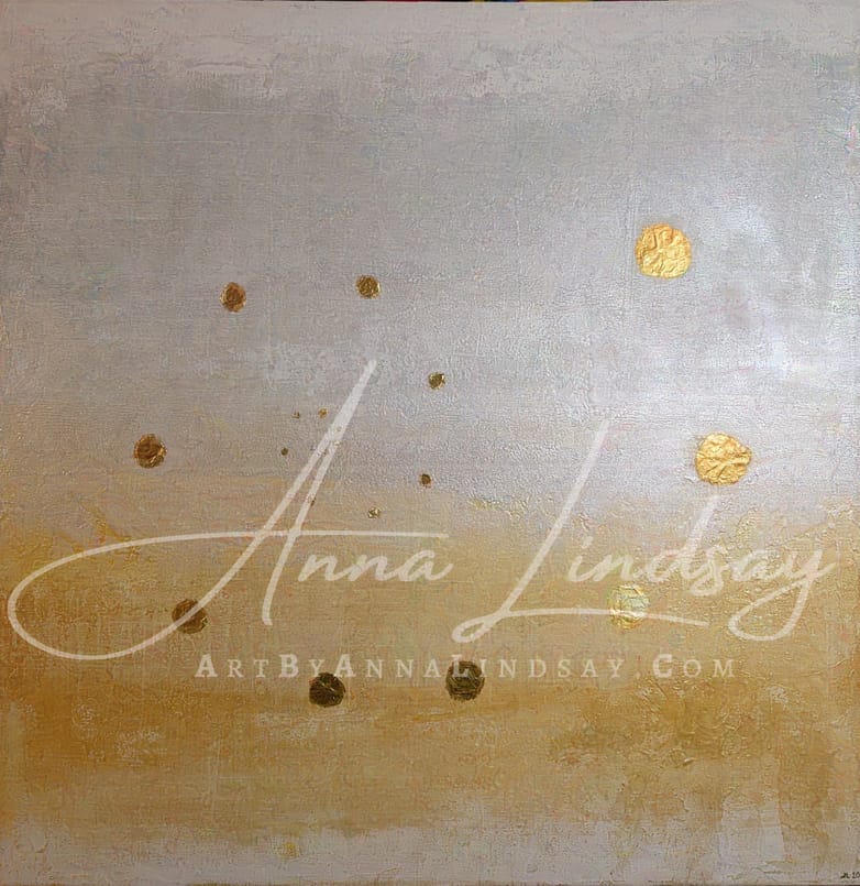 I keep intending to settle into "one style". But then I have an idea for something else, and so my paintbrush takes me in a different direction. That's what happened with One Breath At A Time —so completely different from my other pieces so far!—although still offering what I suppose is becoming one of my hallmarks: moments of pure, intentional stillness. With its luminous silver-and-gold palette, the canvas shimmers softly, shifting with the light, offering a sense of both tranquility and quiet opulence.