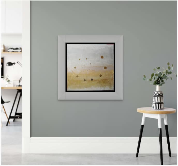 At its heart lies a delicately composed spiral of metallic dots—a symbolic inhale or exhale—drawing the eye inward and outward in rhythmic meditation. This gentle movement echoes the natural rise and fall of the breath, grounding us in the present moment while elevating the space in which this painting is set.