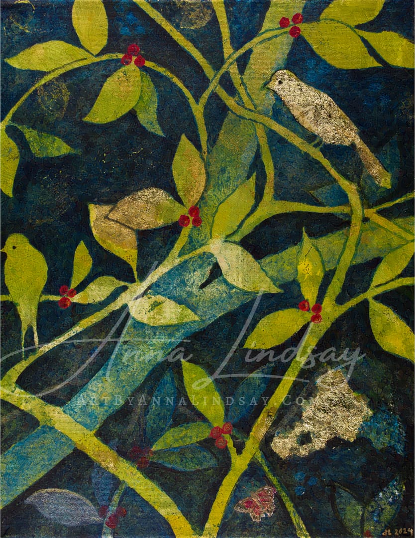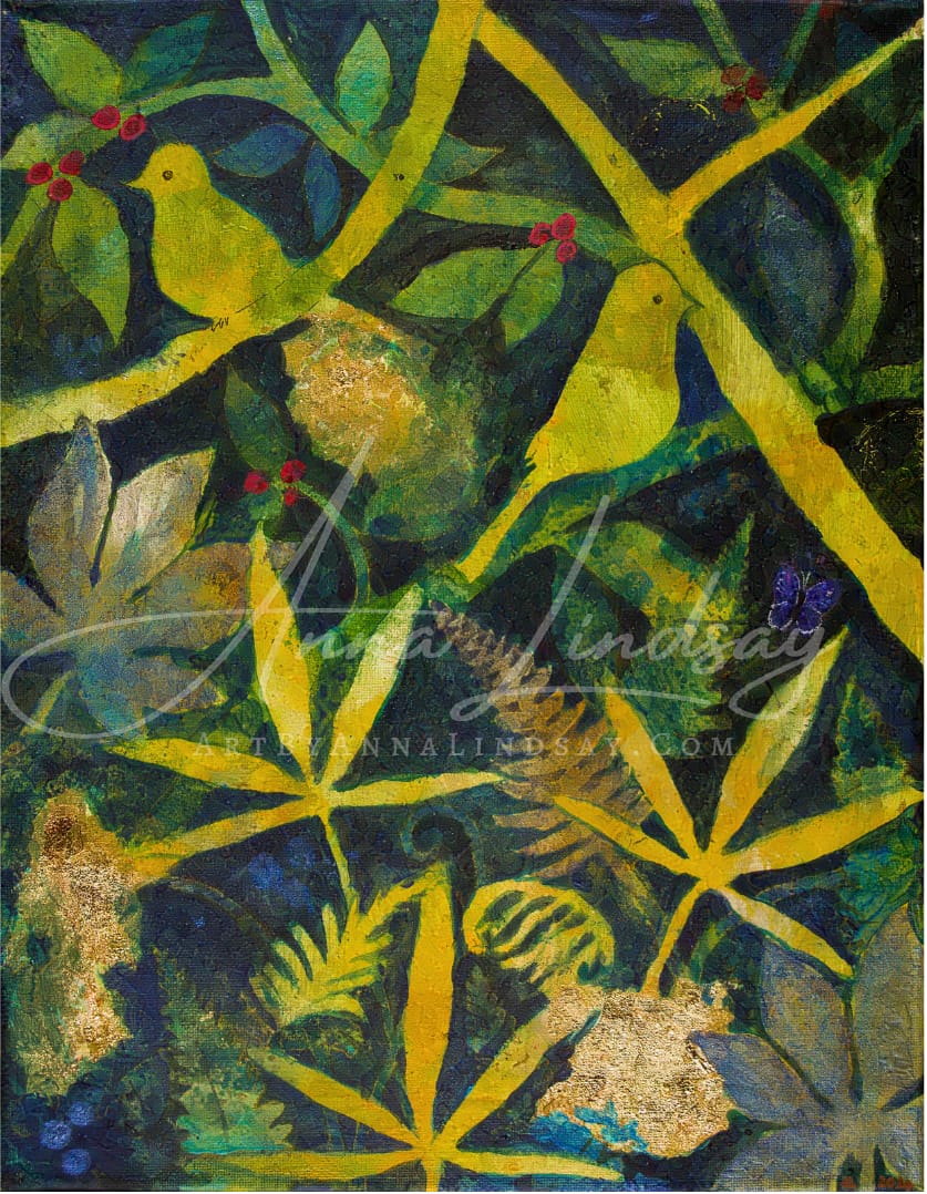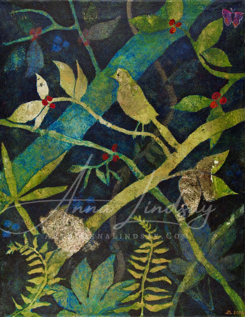 If you watch the timelapse video of my process with this one, you'll see that I was playing with a technique new to me, where each additional layer of paint reveals or obscures different details, creating depth through its harmonious interplay of deep forest tones, botanical silhouettes, and flashes of iridescence and gold leaf. I hope that the result is one both of stillness and depth—a moment where the forest breathes and secrets stir.