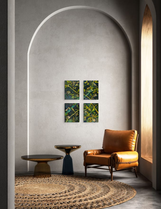 Step into Woodland Dark—a richly layered quadriptych that invites us to slow down and truly see. I painted this series of four intimately scaled panels to weave a mysterious, dreamlike tableau of nature’s hidden sanctuaries.